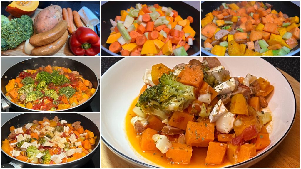 Herbstpfanne. Kürbis, Süßkartoffel, Paprika, Brokkoli und Mohrrüben werden mit Zwiebeln, Knoblauch und Cabanossis in Rapsöl angebraten, mit Gemüsebrühe und geschälten Tomaten 10 Minuten gekocht und mit Ziegenkäse überstreut, nochmal fünf Minuten zu Ende gegart. Alle Zutaten vorher würfeln, beim Brokkoli natürlich nur den Strunk, die Röschen legen wir die letzten zehn Minuten mit in die Pfanne. Gewürzt wird nur mit Salz, Pfeffer, scharfem Paprika und Petersilie. Ein Traum!