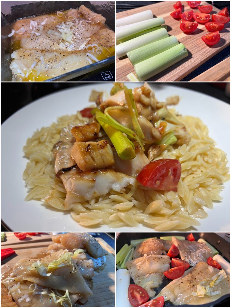 Aus Teriyaki Sauce, etwas Weißwein, Hong und Zitrone rühren wir uns eine Marinade an, in die wird der Kabeljau gelegt und bestrichen. So eine Stunde ziehen lassen. Mit geviertelten Tomaten und halbierten Porreestücken anbraten und wenden, ist er gar kommt er mit Reis oder Risoninudeln oder Reis auf den Teller. Sehr lecker!