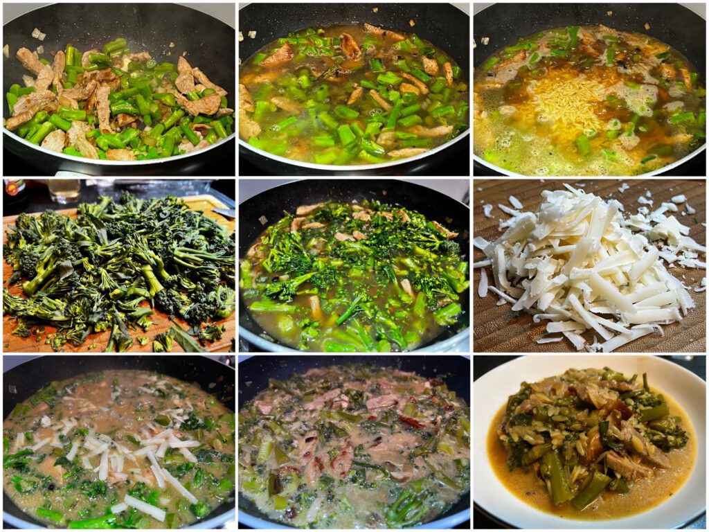 Schweinegeschnetzeltes mit Stangenbrokkoli und Risoninudeln. Dazu Schweinelende in Streifen schneiden, die Brokkolistangen stückeln und Brokkolirosen beiseite legen. Fleisch und Brokkoli stangen mit einer kleingewürfelten Zwiebel kräftig anbraten, pfeffern und salzen, hellen Essig dazugebe und reduziert, mit Brühe aufgießen, Risoninudeln dazugeben und alles aufkochen und ca. eine Viertelstunde kochen. Jetzt Milch und geriebenen Parmesan unterrühren und nochmal fünf Minuten köcheln. Kurz vor Ende noch getrocknete Tomaten dazugeben, fertig.