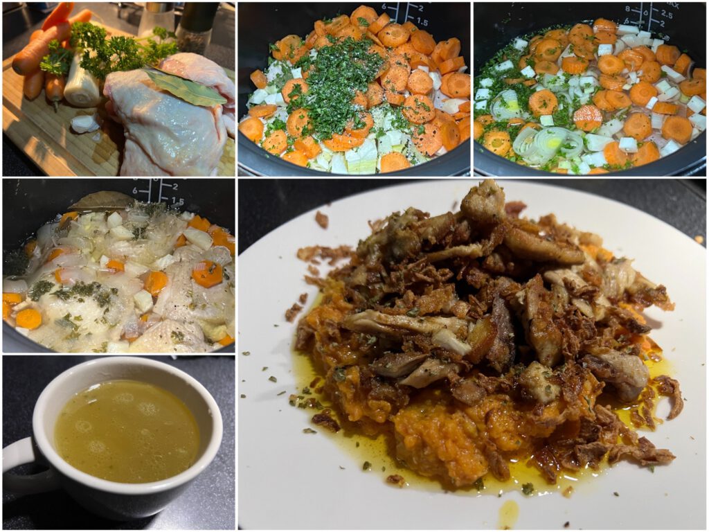 Herbst, Erkältungszeit, da braucht man schon mal eine Hühnerbrühe. Also Schnellkochtopf heraus geholt und die Hühnerschenkel mit Suppengrün hinein, bisschen Salz, bisschen Pfeffer, einem Lorbeerblatt, Deckel drauf und fertig sind wir! Die Brühe schöpfen wir ab, das Fleisch freut sich, also auf, Brühe abgeschöpft und beiseitegestellt. Das Hähnchen befreien wir von seiner Haut und den knochen und das Suppengrün wird mit etwas Butter zerstampft. Röstzwlebeln darüber und fertig! Es ist so lecker